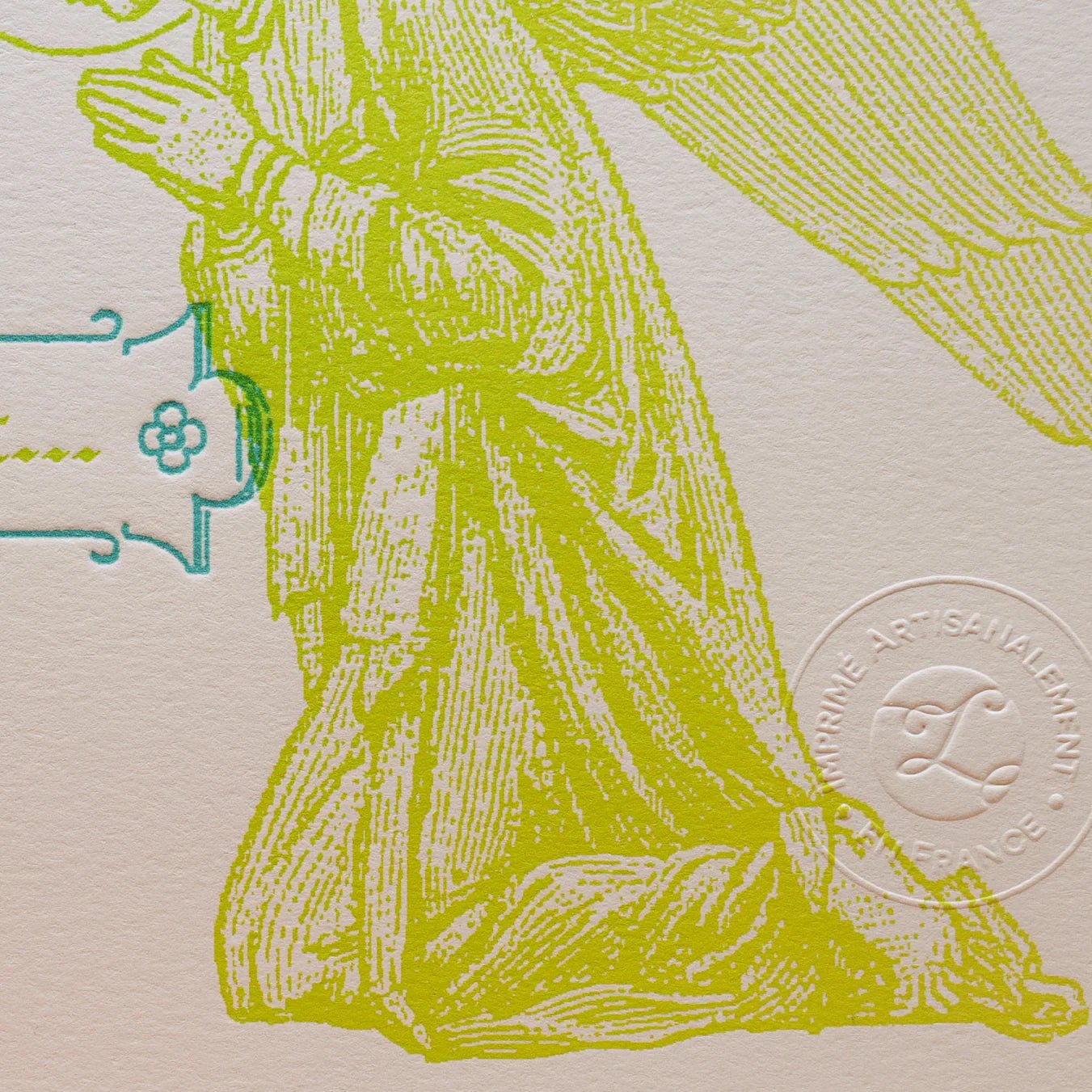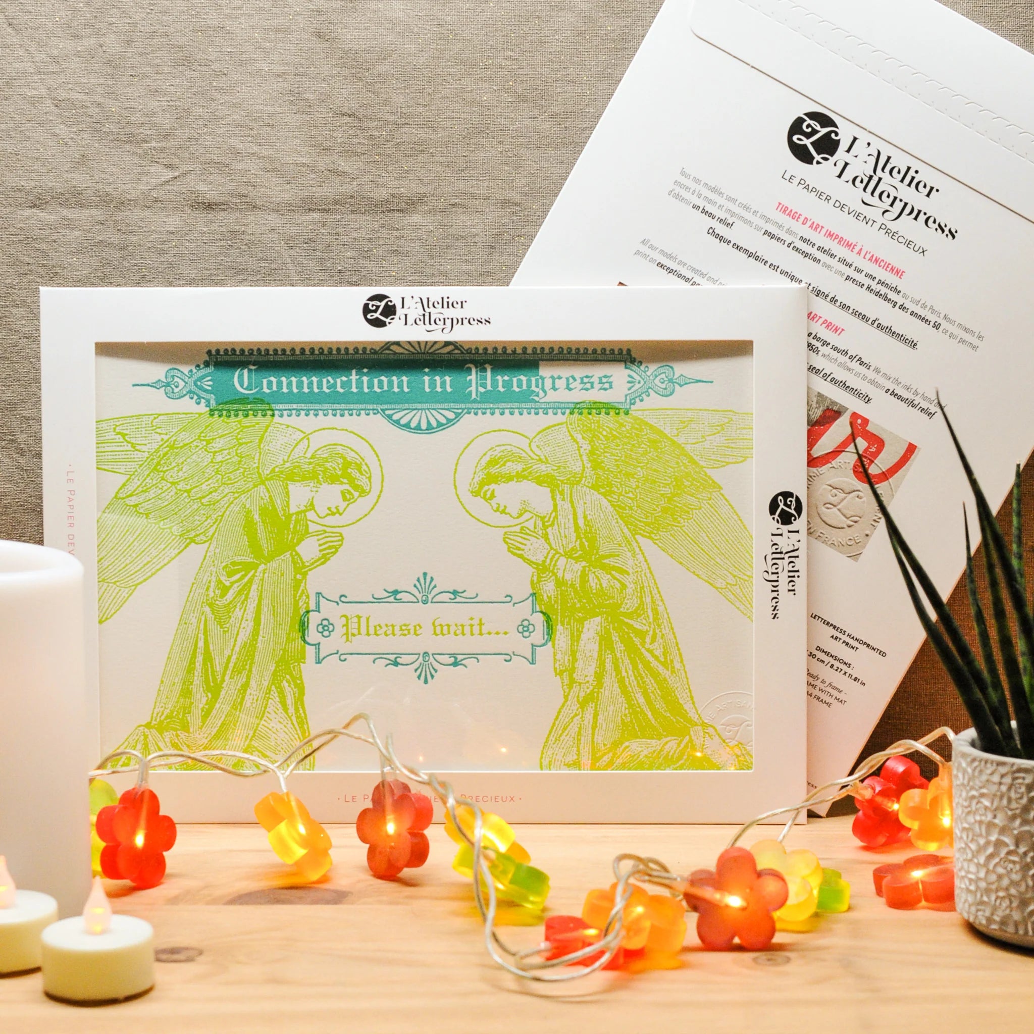The Connected Angels print is a striking art piece from the "Digital Prayers" collection. This sophisticated creation merges vintage pious engraving with contemporary design, rendered on luxurious heavy matte paper and authenticated with an embossed seal. Each print arrives in an elegant cardboard sleeve featuring English and French explanations detailing the design and artisanal printing process. Handcrafted on FSC-certified paper at on a barge workshop south of Paris, this A4 print exemplifies sustainable luxury and meticulous craftsmanship.