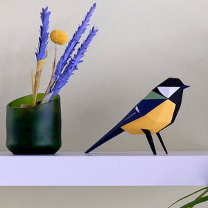 The Great Tit (Parus Major) captivates with its distinctive black tie contrasted against a vibrant yellow breast. A beloved garden visitor in our gardens and parks rendered in paper form. Once all the craft kit parts are folded and glued, you’ll have a colourful and striking bird which combines ornithological authenticity with the meditative satisfaction of paper craftsmanship, leaving you with in a sculptural accent that celebrates both nature and origami.